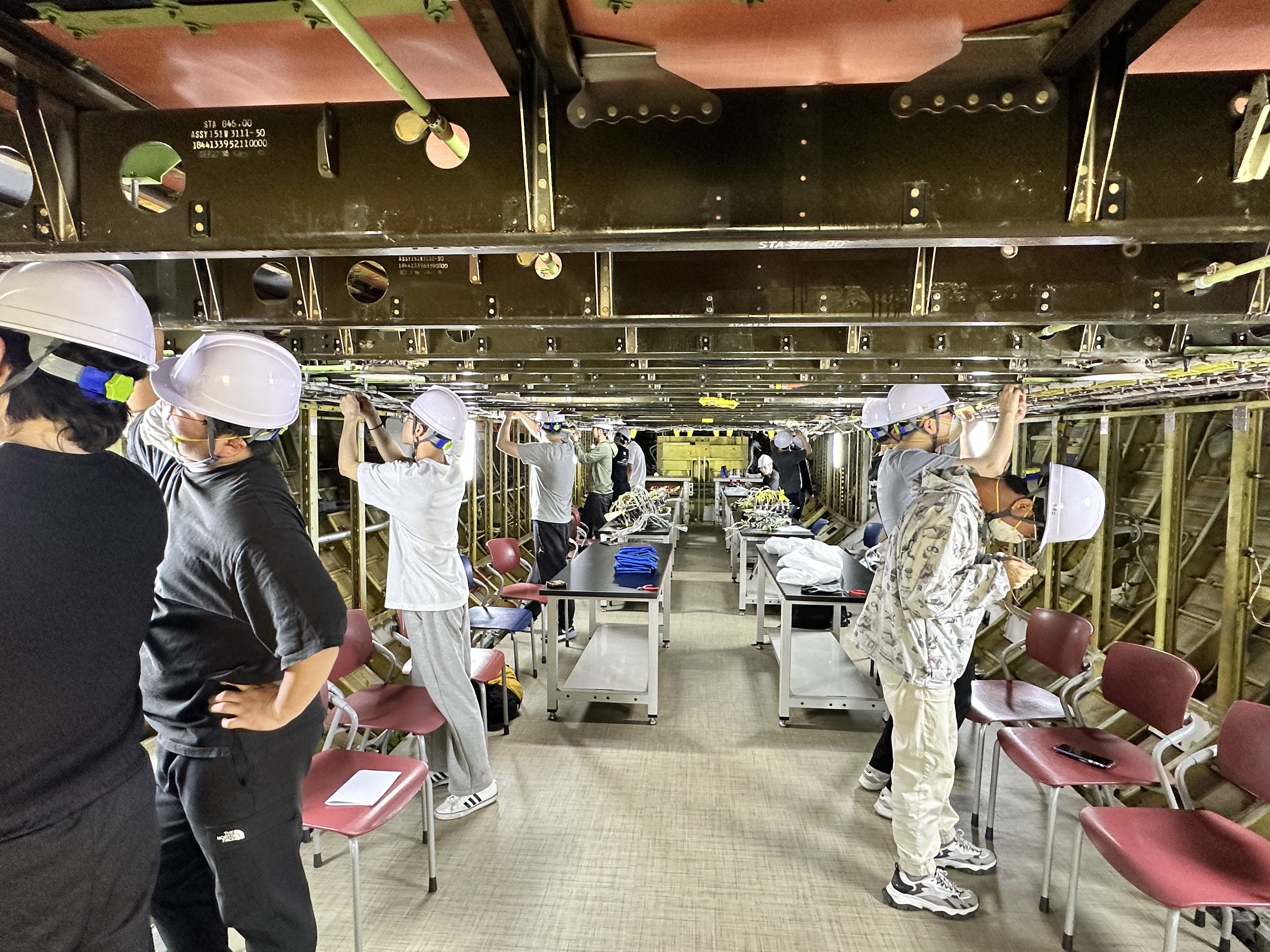 항공기 기체 정비 관련 역량 개발을 위한 실습실로, 기체 구조 이해, 구조부 점검, 체결 검사 작업 실습 진행